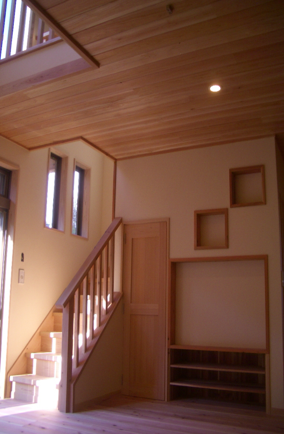 の仕上げ。一般的なビニールクロスの仕上げとはちがう趣のある仕上りになりますし、面積が意外と多い分、木材の「調湿作用」も充分に機能します。桧特有の香りや、針葉樹の効用でもある柔らかな音の反射などの効果で人に優しい居住空間が実現します。